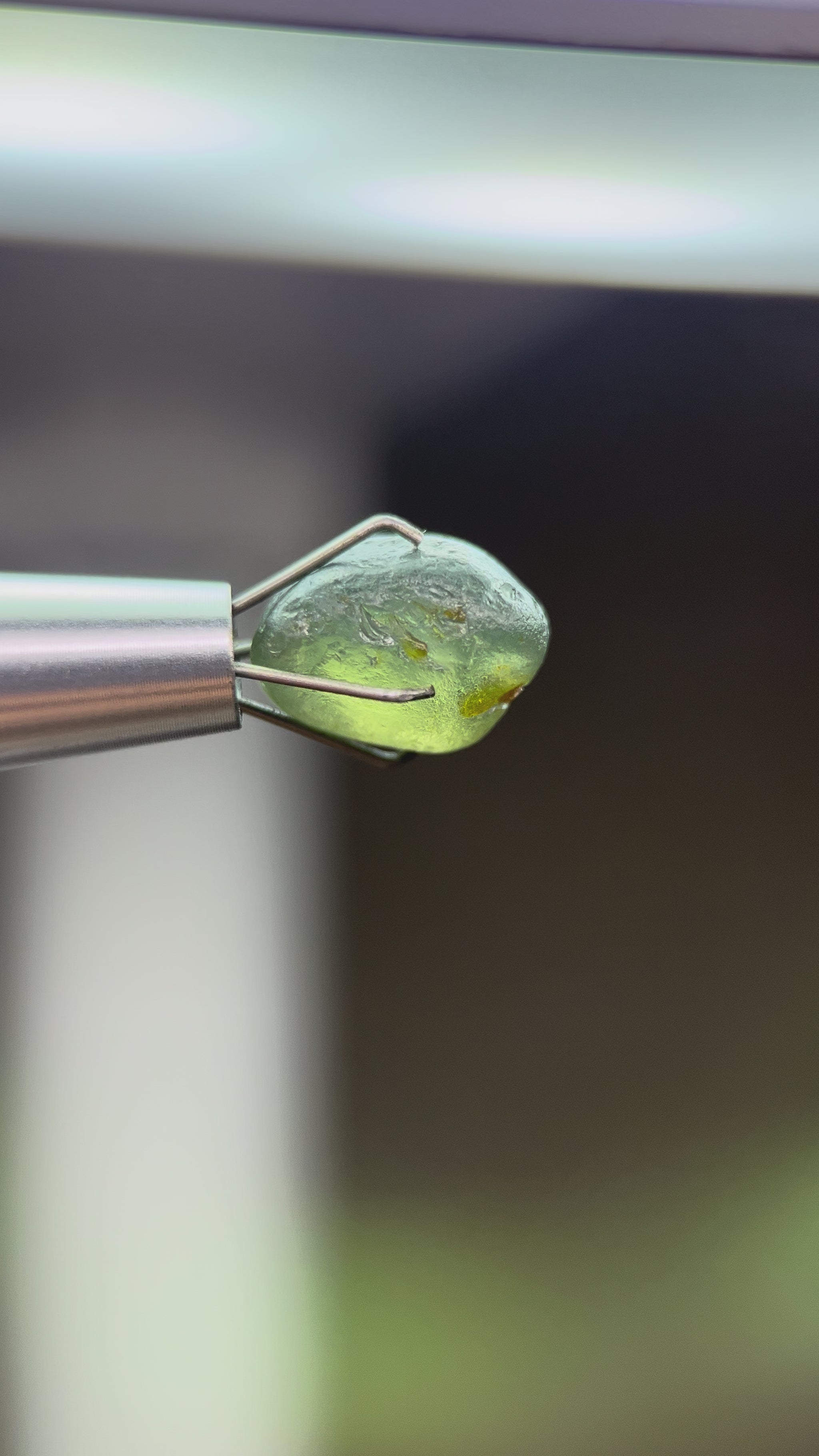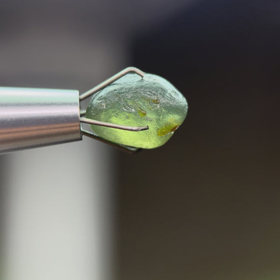 タンザニア産ジルコンです。表面はやや黒みを帯けて見えますが、光が透過すると、ブルーグリーンのなめらかで深みのある輝きを放ちます。重量:6カラット。