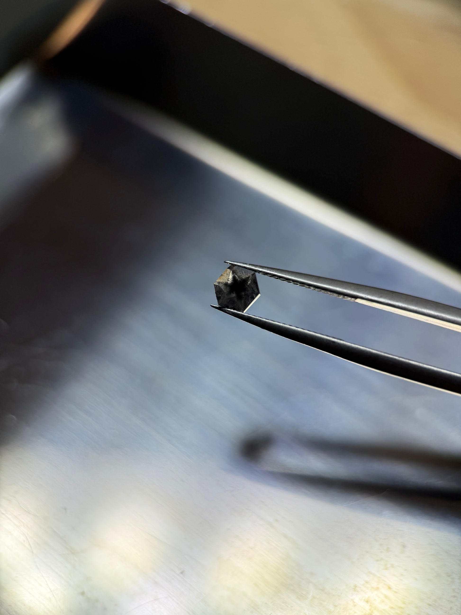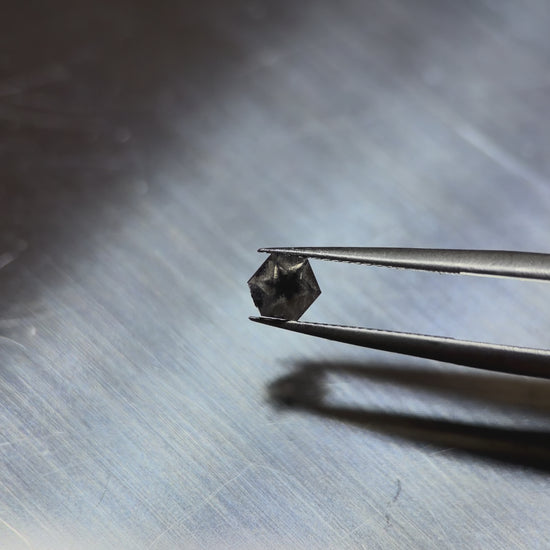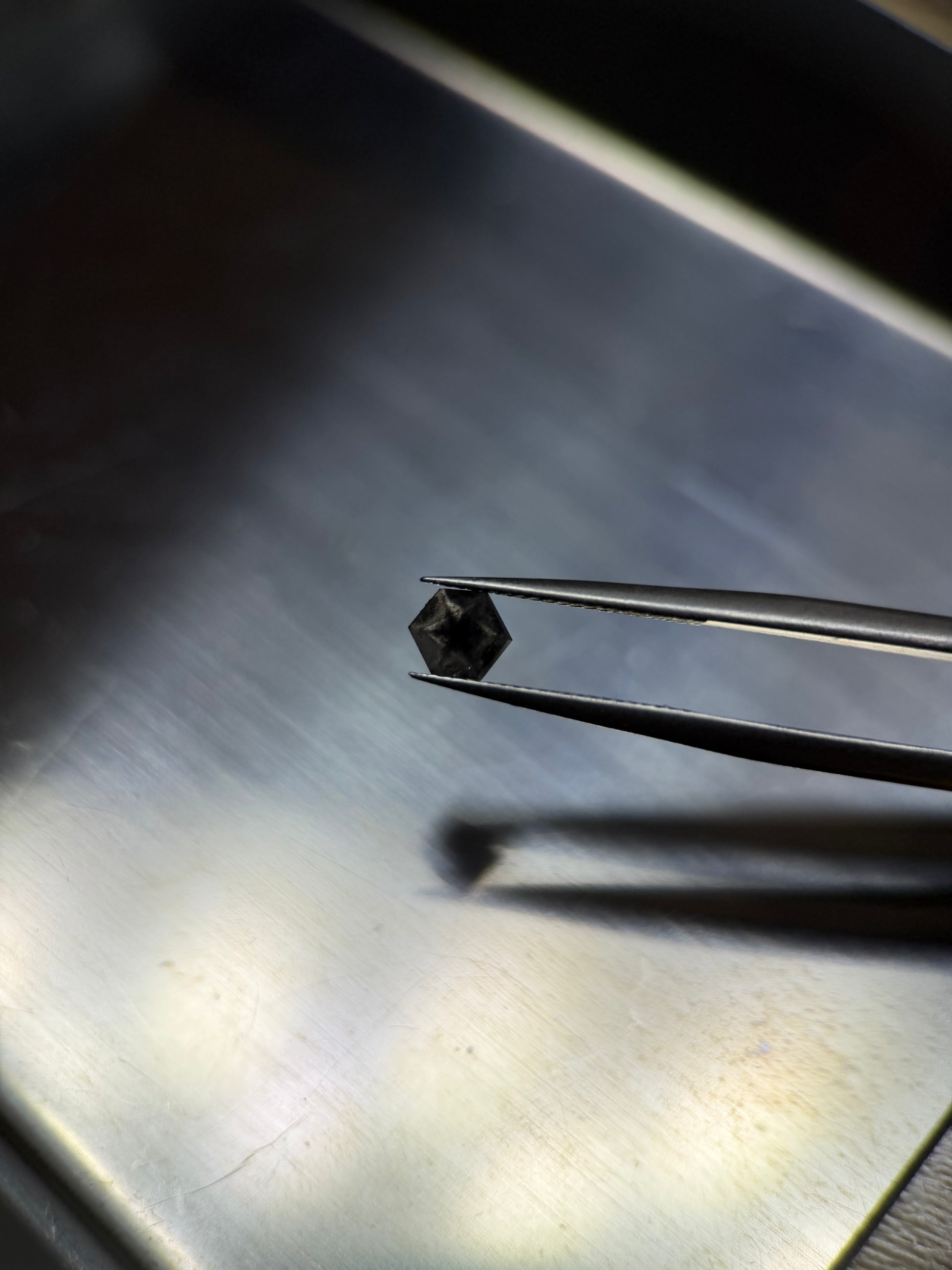重量:0.6カラット、サイズ:5.1x1.9mm。このガーネットはグラファイト含有量がやや高いですが、想像していたほど黒くはなく、サイズが比較的小さく、明らかなクラックは確認できません。
