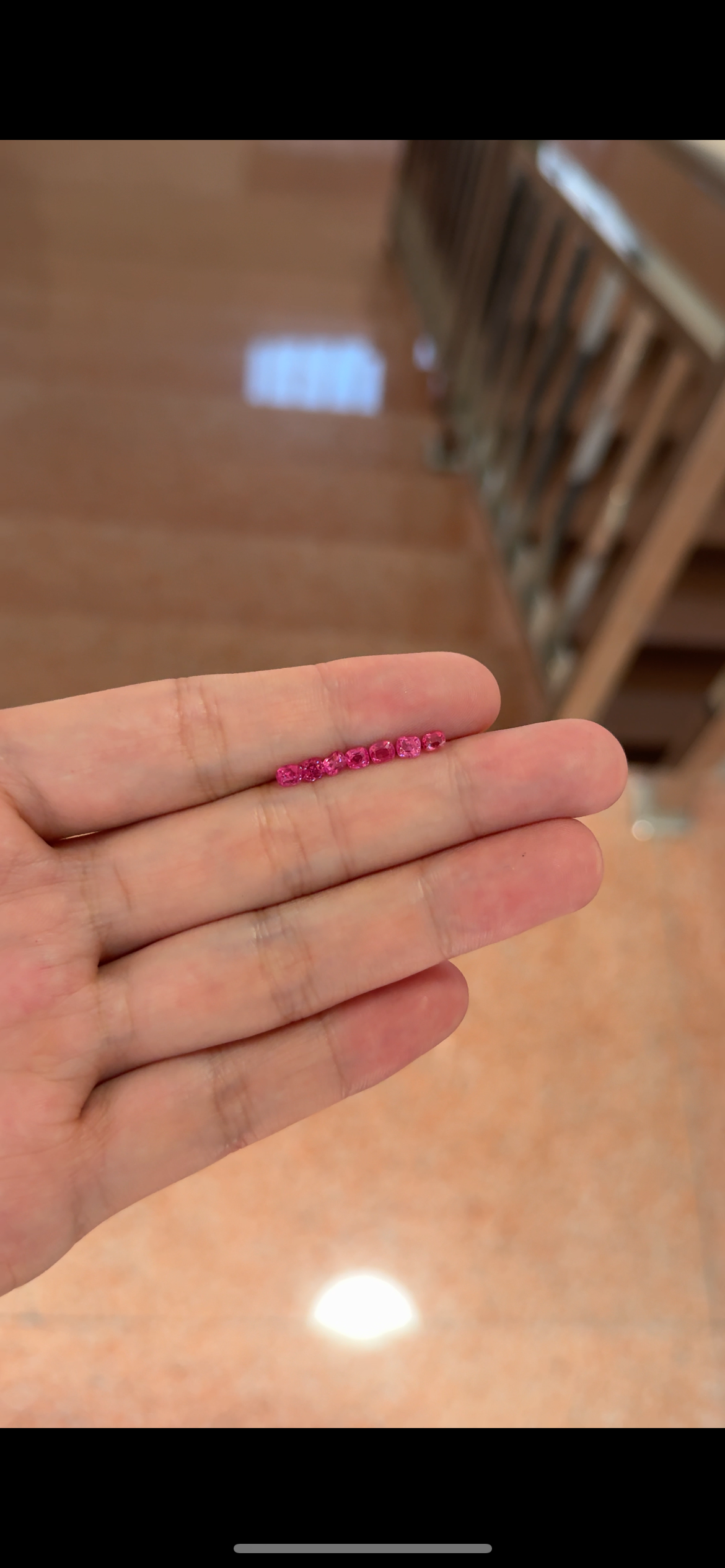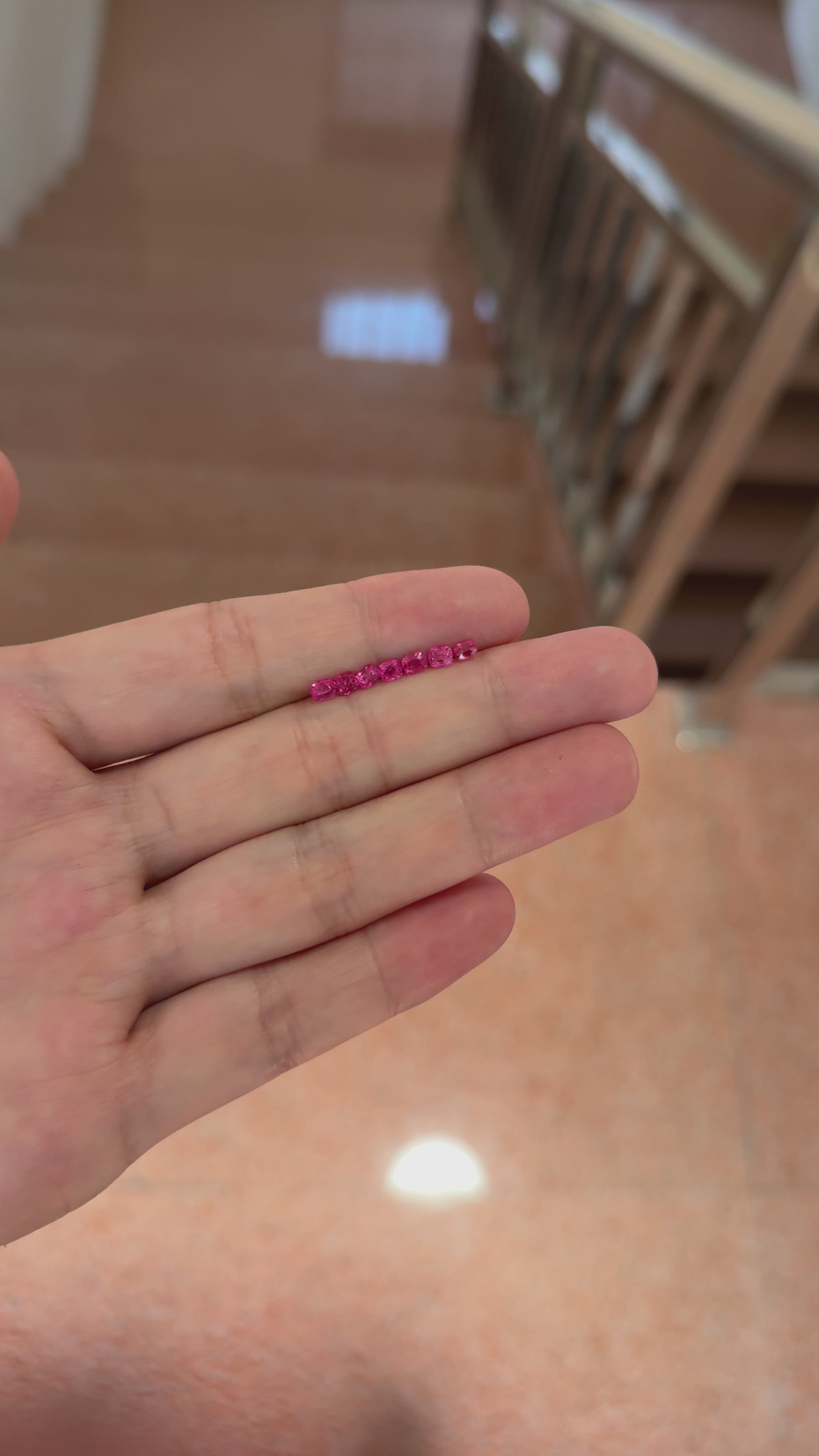 7粒のピンク・スピネルですね。総重量は1.81カラットです。一部の業者さんでは「サムライ・スピネル」として売られたりしていますが、私はジェダイ・スピネルの基準には満たないと思います。1粒平均0.20~0.30カラットで、ちょっとカットが不揃いなものや、小さな内包クラックがあるものもあります。